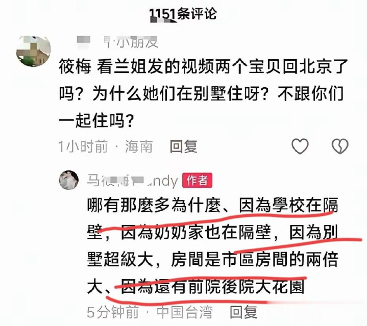 在评论区也同样回应网友,孩子们学校就在隔壁,奶奶家里也在隔壁,别墅很大,房间是市区房间的两倍,还有两个花园。言下之意就是一家人是住一起的,只是因为房子大,活动范围很广,张兰视频没有拍到而已。